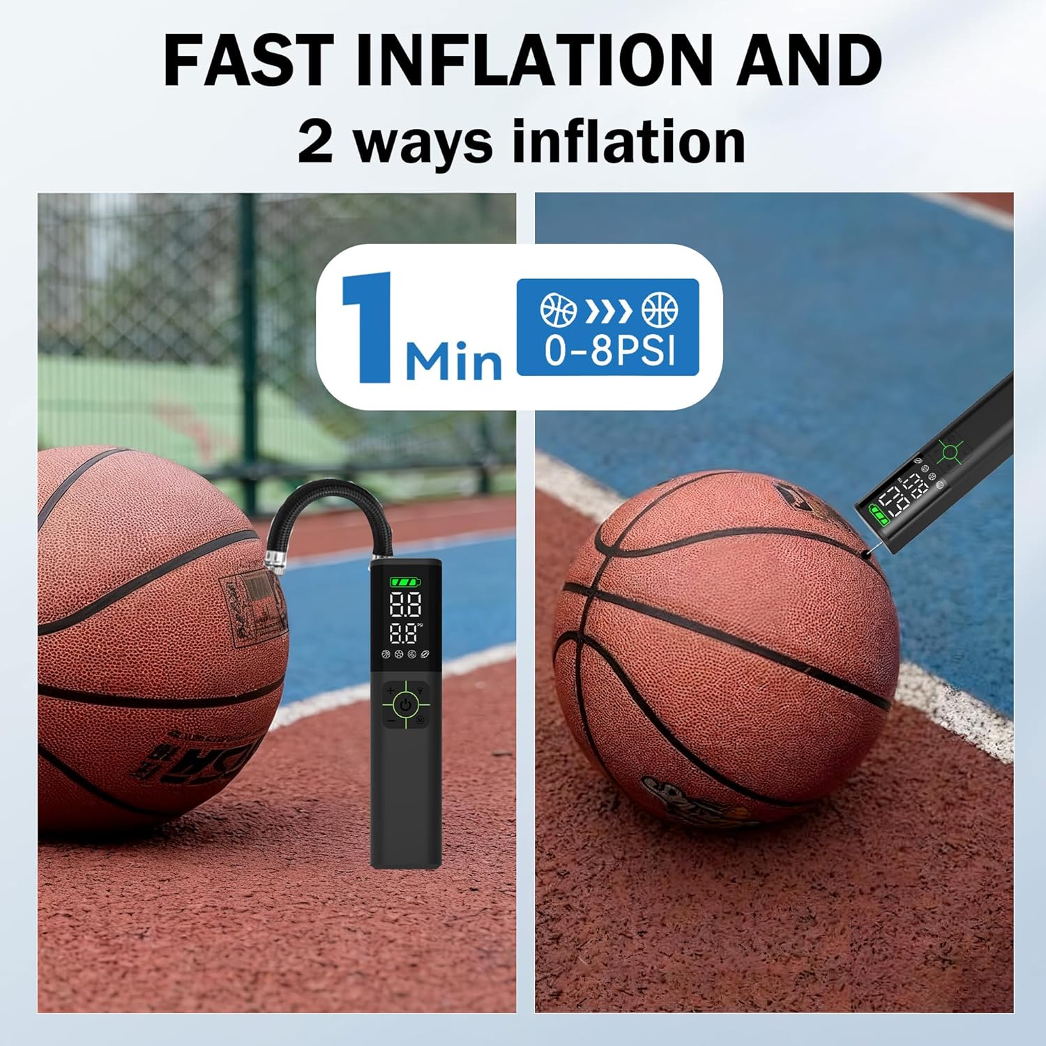 【Smart Auto-Stop & Precision Presets】This Z10 electric ball pump automatically STOPS when the preset PSI is reached, preventing over-inflation. The LCD screen and precise gauge let you monitor progress. With 4 smart presets (Basketball, Football, Volleyball, Soccer) and a custom 2-15 PSI mode, it's the ultimate air pump for sports balls. Inflates a basketball to perfect pressure in about 50 seconds—completely hands-free!