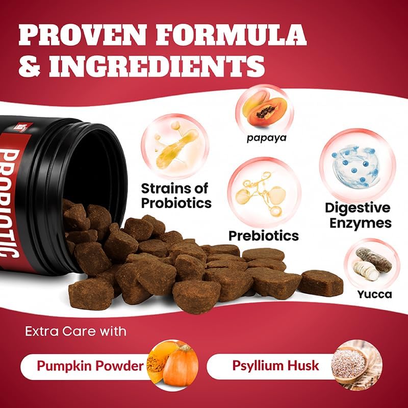 【Probiotics for Digestive & Immune Support】 10 probiotic strains support healthy gut flora, digestion, and immune balance, helping reduce loose stool, gas, bloating, and promoting comfort in dogs with sensitive stomachs.