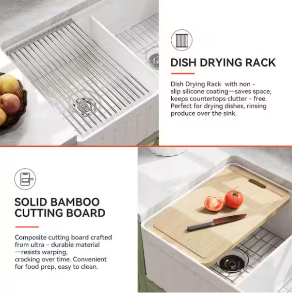 Includes cutting board, strainer, bottom grid, drain assembly