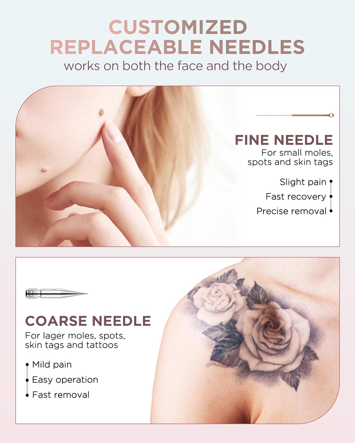 [Replaceable Needle & Easy to Use] OPHERA Skin Tag Removal Kit Provide two different needles, fine needle removes small mole, spot, freckle and skin tag. And coarse needle is advanced in removing large mole, spot, wart and tattoo. The plasma pen comes with a spotlight that illuminates the area you're working on. You can check the intensity level and battery level on the digital display. With 6 easy-to-follow steps, your skin will be rejuvenated in 15 minutes.