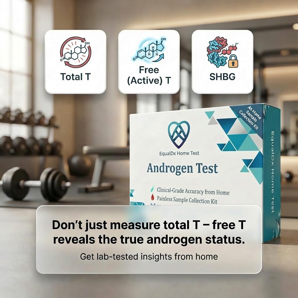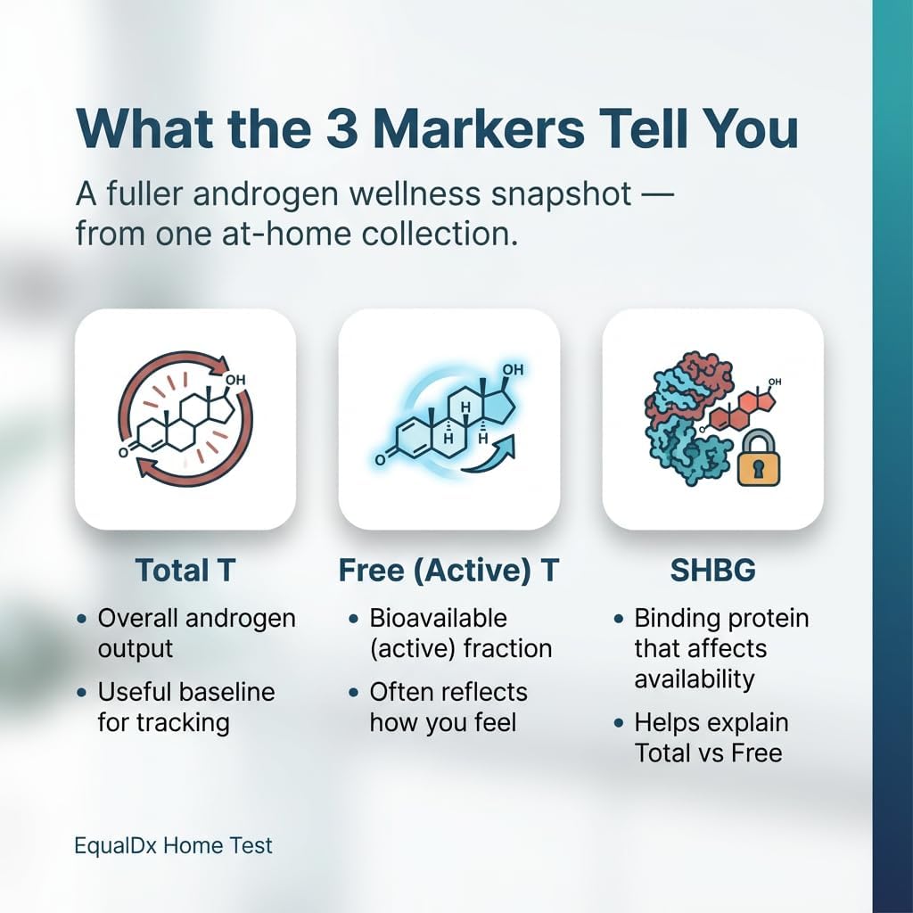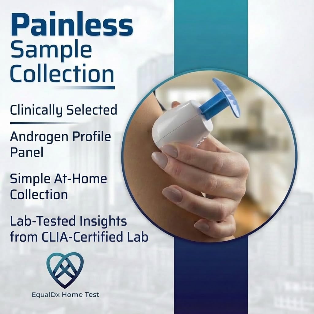 Comprehensive Androgen Profile –This at-home collection kit rovides a detailed view of androgen-related hormones: Total T, Free Androgens, and SHBG (sex hormone-binding globulin) to support wellness tracking and overall health awareness.
