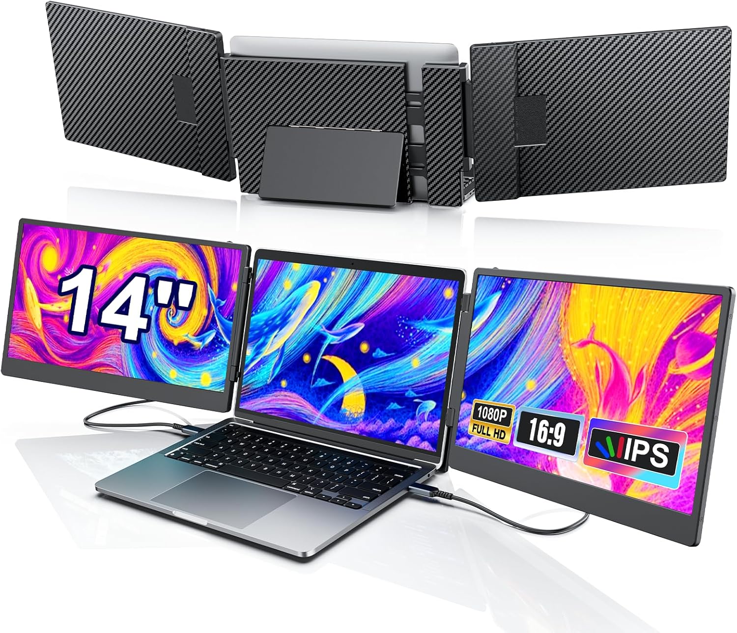 【Hocheffizientes Büro】Triple Portable Laptop Monitor Erweiterung unterstützt zwei Erweiterungs-/Spiegelungsmodi und ermöglicht so gleichzeitiges Multitasking und eine Steigerung der Arbeitseffizienz um bis zu 300 Prozent. Das innovative abnehmbare Design ermöglicht die freie Kombination des Bildschirms für die Zusammenarbeit mit zwei Bildschirmen oder die kombinierte Nutzung. Mit den multifunktionalen Einstelltasten können Sie Helligkeit, Farbton und Ton individuell einstellen. Ob Videokonferenz, Geschäftspräsentation oder mobiles Büro, es ist einfach zu handhaben.
