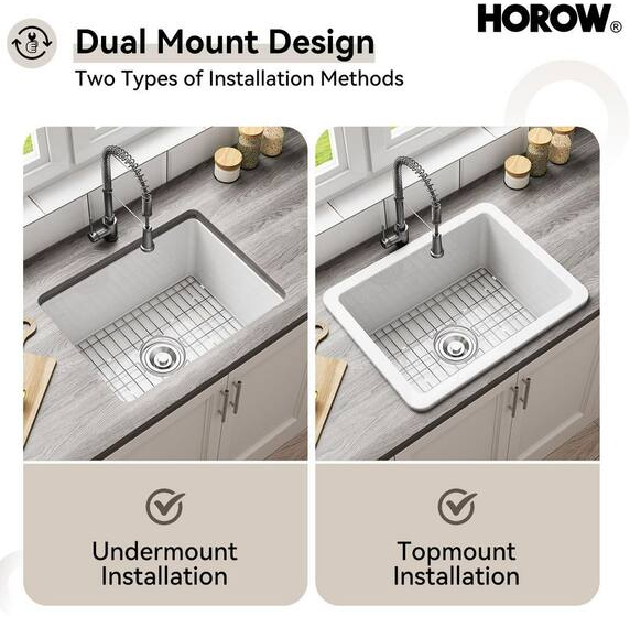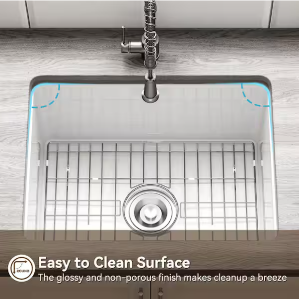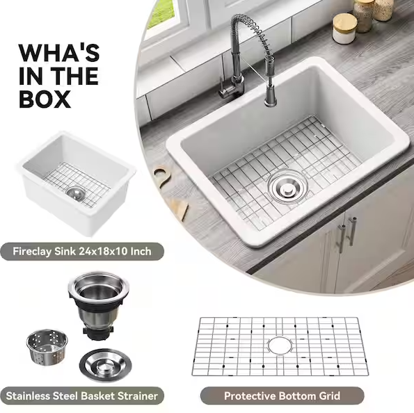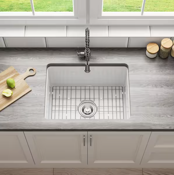 [V4869]CozyStream 24 in. Undermount/Drop-In Single Bowl White Fireclay Kitchen Sink with Bottom Grid and Strainer-(Image review)