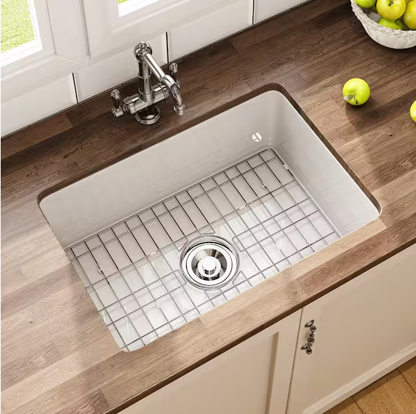 [V4867]CozyStream 27 in. Undermount/Drop-In Single Bowl White Fireclay Kitchen Sink with Bottom Grid and Strainer-(Image review)