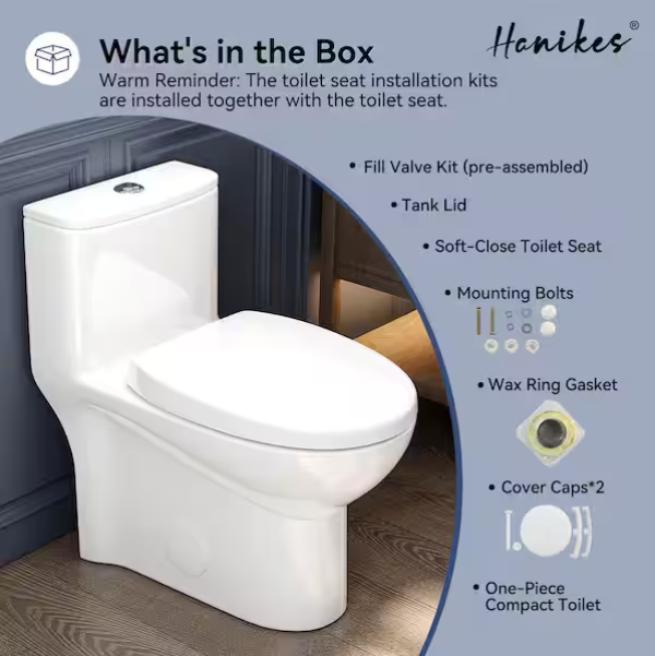 [V]1-Piece 1.1/1.6 GPF Dual Flush Compact Elongated WaterSense Toilet in White Soft Close Seat Included-(Image review)